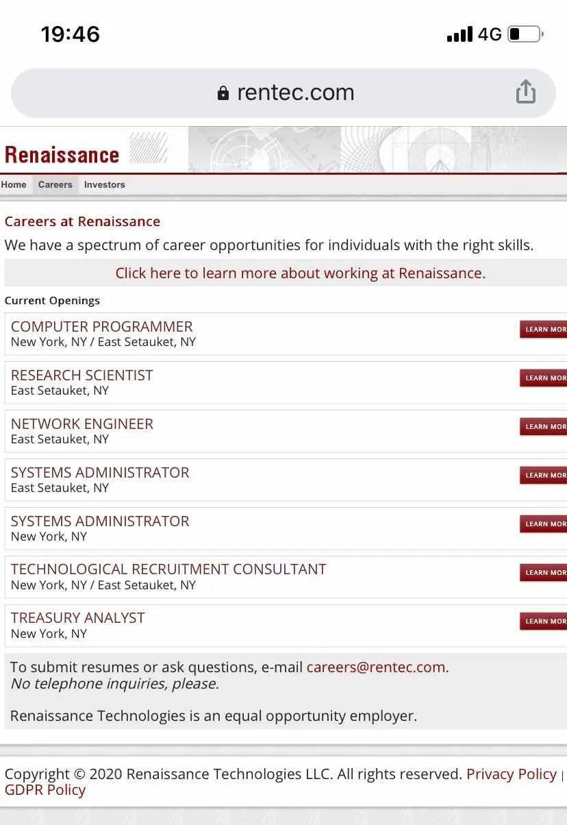 查阅文艺复兴科技的招聘历史,会发现他们只招数学、物理及统计等背景的博士生,不招金融背景的员工。但在外界看来,这恰巧是大奖章能取得超高收益率的秘诀之一。