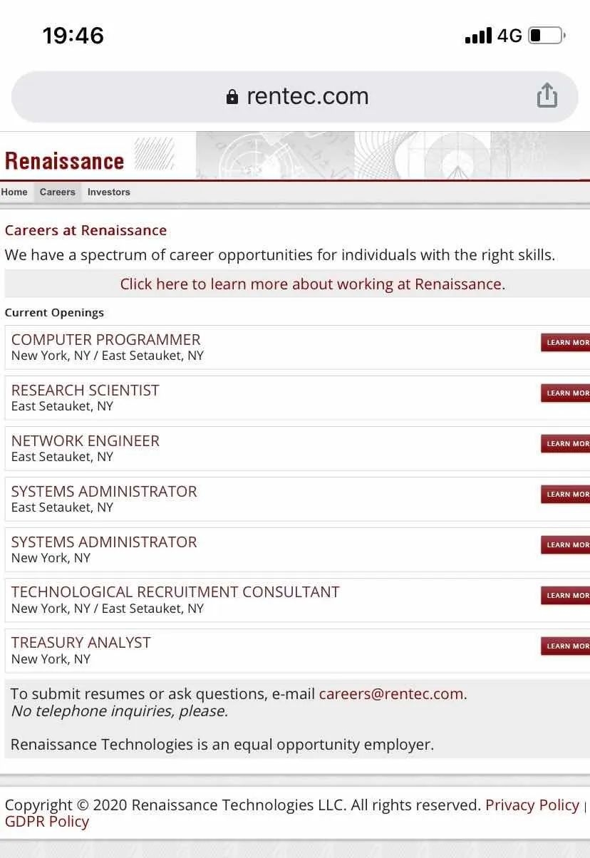 文艺复兴科技公司官网上的招聘信息1989年,文艺复兴科技公司管理资金的规模仅为2000多万美元,而现在,该公司管理规模已破千亿美金。据该公司今年2月向美国证监会提交的13F报告,截至2019年12月31日,文艺复兴科技资产管理规模达1301亿美元,直追桥水基金的1600亿美元。